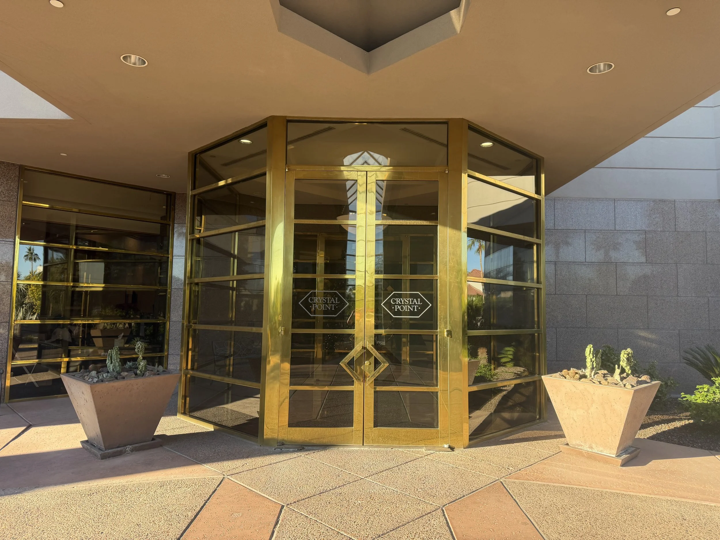 The property’s entry is defined by towering, expansive gold doors that set a bold and elegant tone for the Crystal Point lobby.